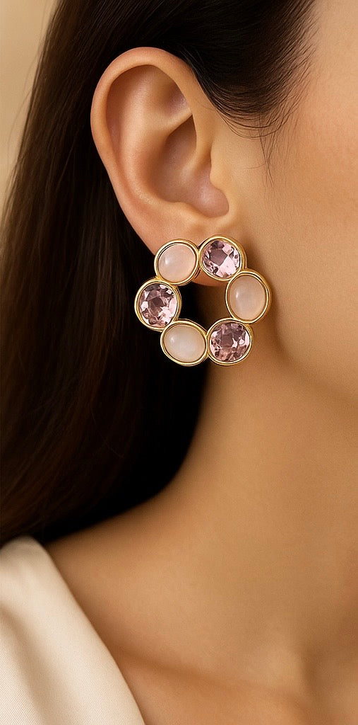 Elegant circle earrings with pink and peach Swarovski stones. Lightweight, anti-tarnish and perfect for weddings, parties, or everyday elegance. Shop now.