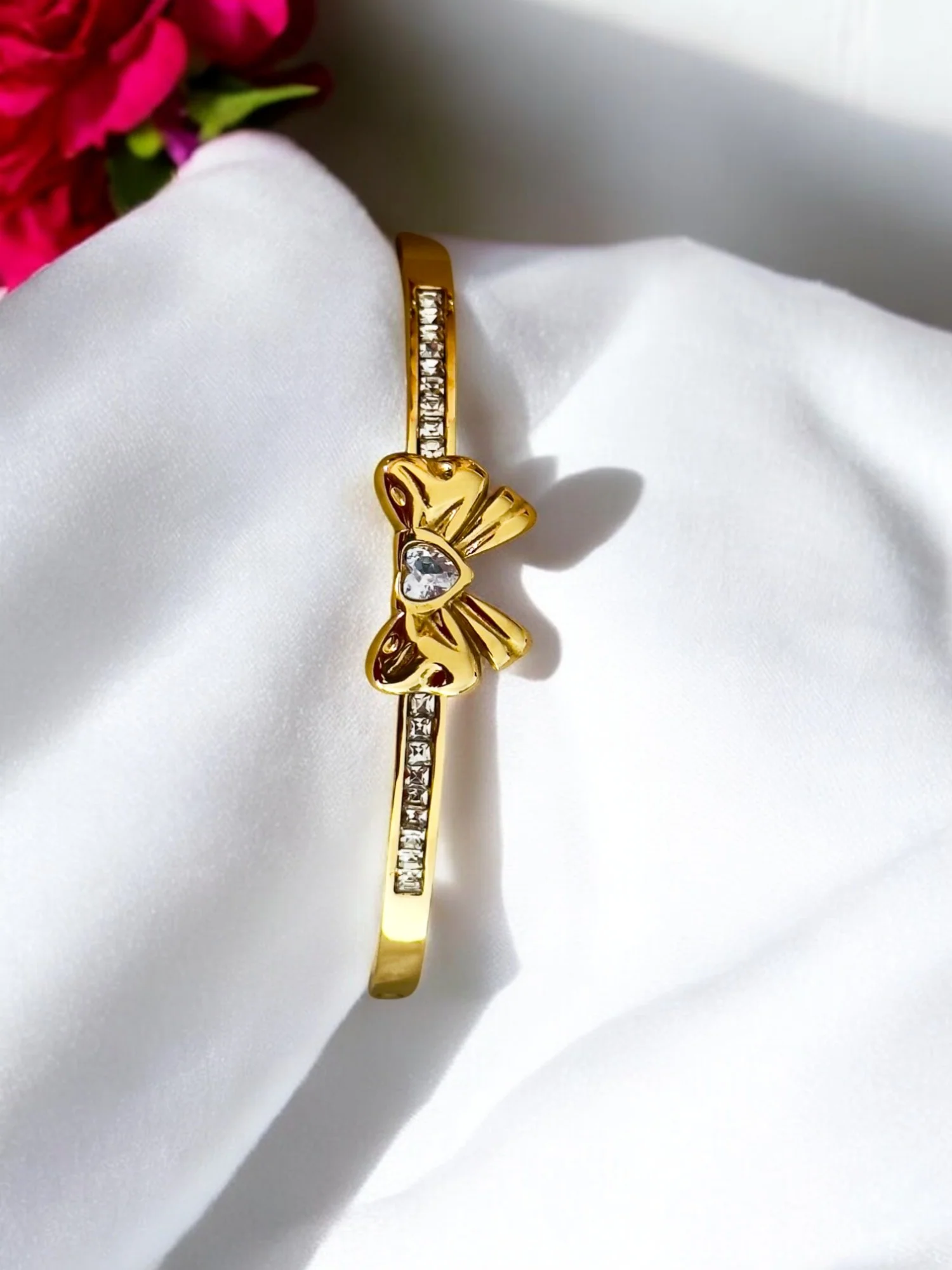 Delicate, feminine, and full of charm — the Elegant Gold Bow Band Cuff Bracelet by Jewels by Radhya is a graceful piece that adds a soft statement to your wrist. Featuring a sleek gold-tone band with a dainty bow detail, this cuff is the perfect blend of modern minimalism and romantic elegance.