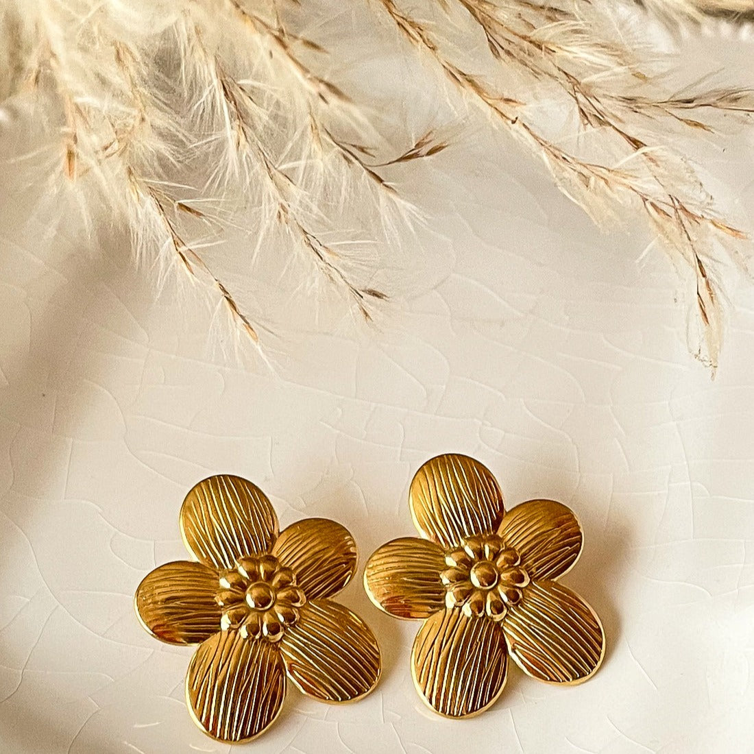 The Gold Floral Stud Earrings by Jewels by Radhya bring a touch of nature-inspired elegance to your jewelry collection. Featuring a graceful floral design with a radiant gold finish, these hypoallergenic earrings are ideal for everyday wear or special occasions.