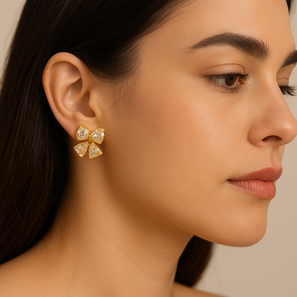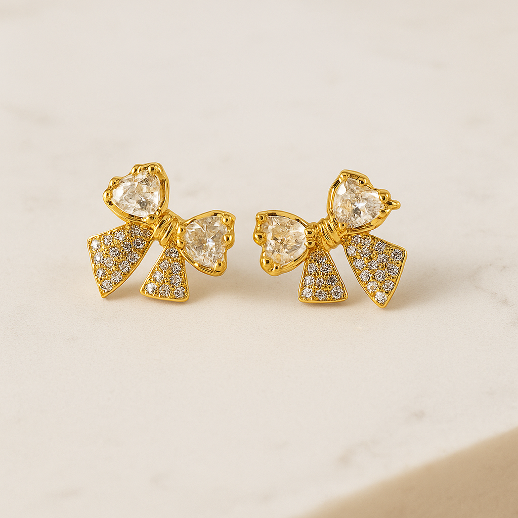 Bring playful elegance to your collection with our Golden Bow Zirconia Stud Earrings. Featuring heart-cut central stones and pavé-set zirconia detailing, these adorable bow-shaped studs radiate timeless sparkle. The warm gold finish adds a touch of sophistication, making them perfect for both casual outfits and special occasions. Lightweight, hypoallergenic, anti-tarnish, and waterproof, they’re designed for all-day comfort and lasting shine. Whether you’re gifting someone special or treating yourself, these handcrafted earrings by Jewels by Radhya are a delightful expression of style and femininity.