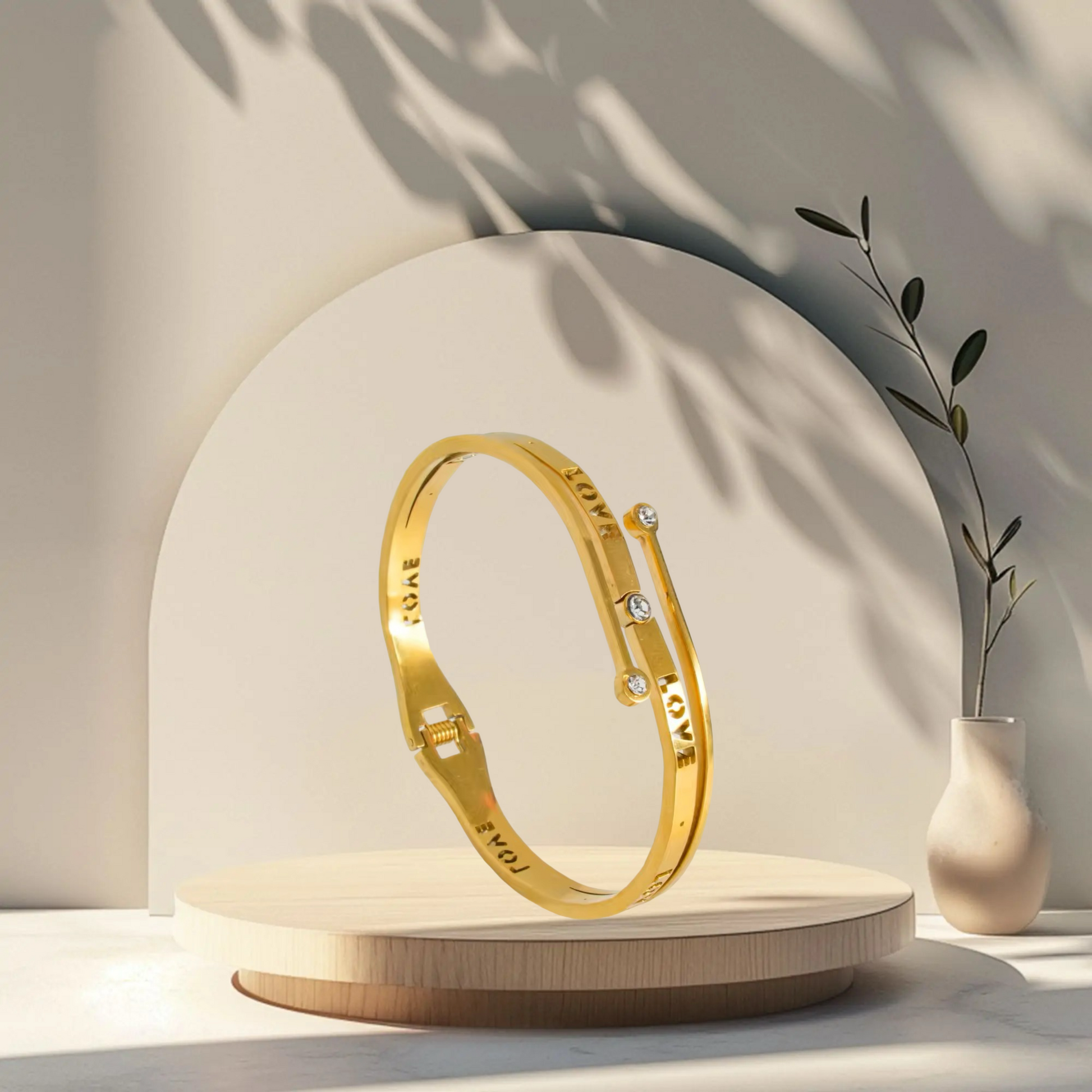 Celebrate love and elegance with the Love Engraved Dual Gold Bracelet by Jewels by Radhya. This stylish bracelet features a double-band design with a refined love engraving, symbolizing timeless affection and modern luxury. Its sleek structure and radiant gold-tone finish make it the perfect blend of subtle sophistication and statement jewelry charm.