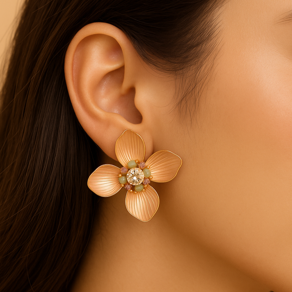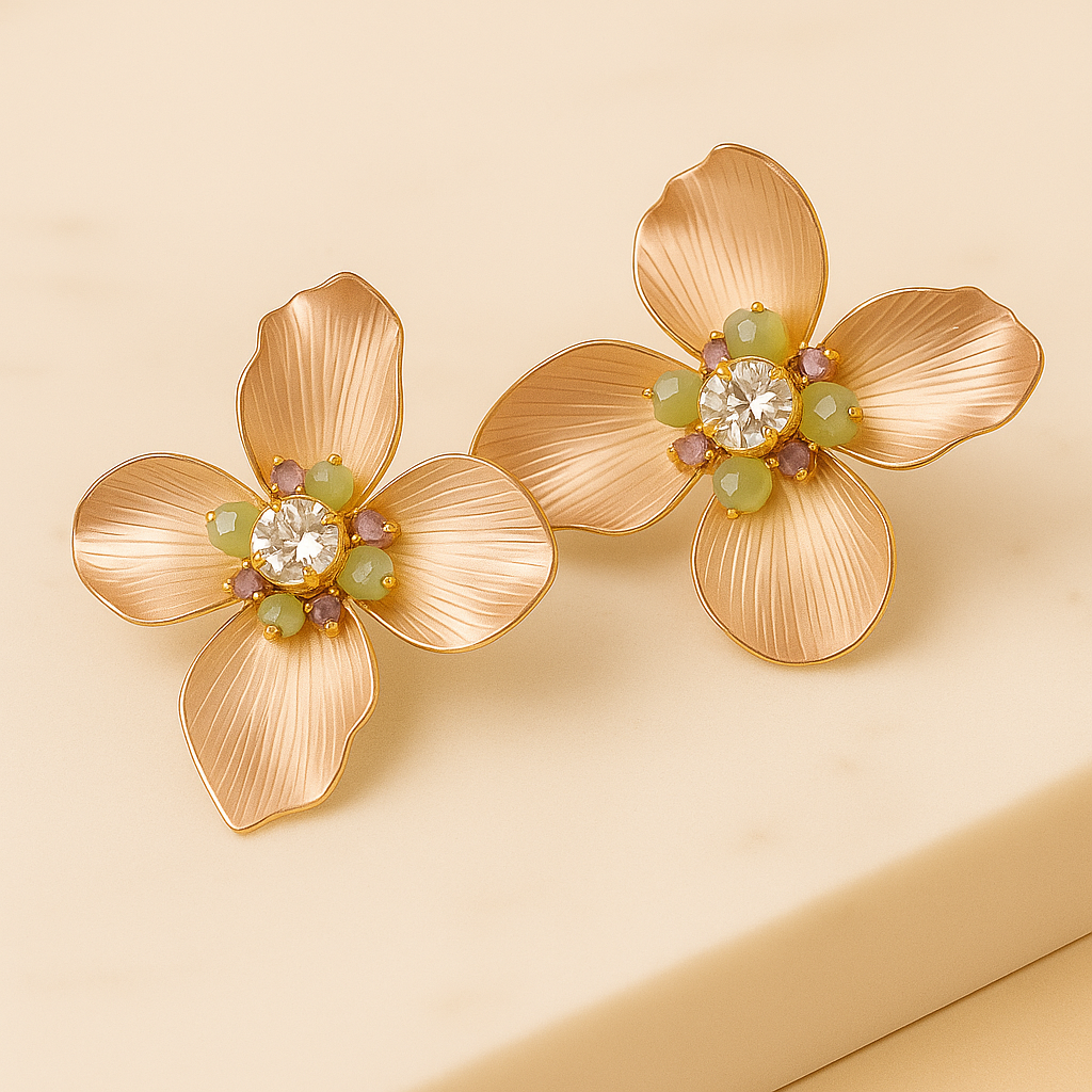 Channel soft elegance with our Rose Dew Petal Bloom Earrings, designed to capture the beauty of delicate blossoms touched by morning dew. Featuring textured gold-toned petals paired with pastel green and lavender bead accents, the earrings are centered with a brilliant-cut zirconia for just the right sparkle. Lightweight and feminine, they are crafted to be hypoallergenic, anti-tarnish, and waterproof – making them perfect for long hours of effortless beauty