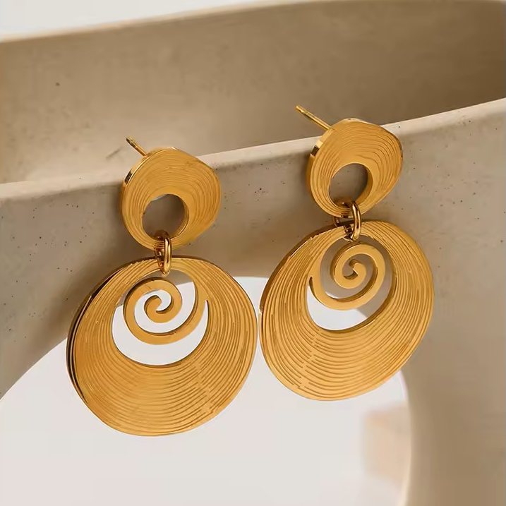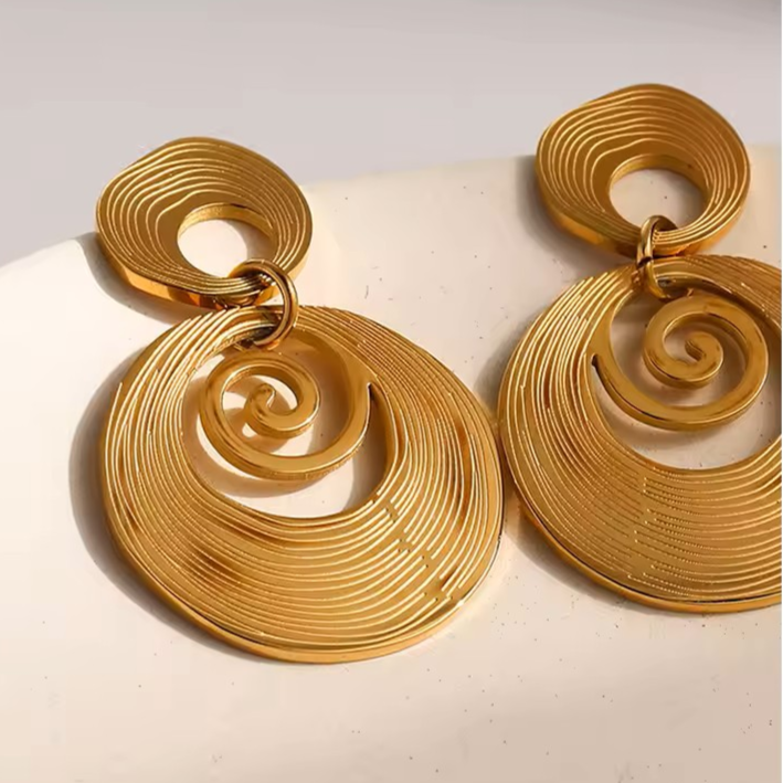 Turn heads with the bold and artistic design of the Spiral Swirl Statement Earrings from Jewels by Radhya. These eye-catching earrings feature an abstract swirl-shaped silhouette in a radiant gold-tone finish, designed to add drama, movement, and sophistication to your look.